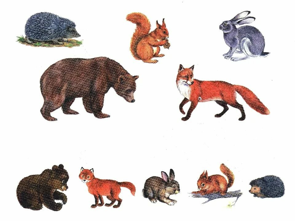 Рассмотреть картинки: назвать какие животные(дикие, домашние), назвать животных, слова ЁЖ, БЕЛКА соотнести с картинкой.